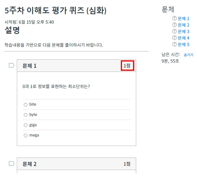 다양한 질문 유형 별 문제가 표시됩니다. 각 문제 우측 상단에는 해당 문제의 배점이 표시됩니다.
