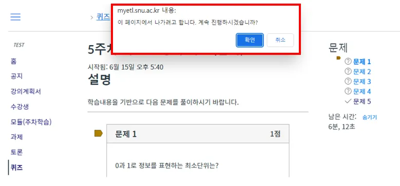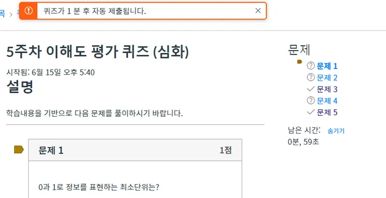종료일이 임박한 퀴즈를 시작하면 경고 팝업 배너가 나타납니다. 우측 메뉴를 통해 퀴즈가 종료될 시간과 남은 시간을 볼 수 있습니다.