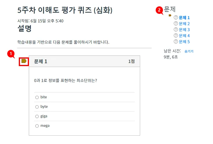 퀴즈를 풀다가 특정 문제로 손쉽게 돌아갈 수도 있습니다. 특정 문제에 플래그[1]를 달아 표시해두면 다른 문제를 풀다가 문제 제목 좌측의 플래그를 누르면 원하는 문제로 되돌아갑니다.