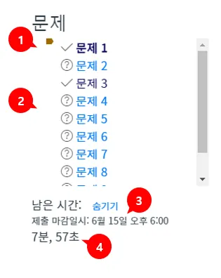 응답한 문제는 굵게 표시되고 체크 표시 아이콘[1]으로 구분되며, 아직 풀이하지 않은 문제는 흐리게 표시되고 물음표 아이콘[2]으로 구분됩니다.