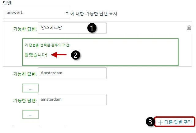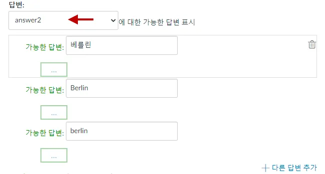 드롭 다운 메뉴의 각 항목에 대해 정답으로 인정해 줄 수 있는 복수 정답들을 추가할 수 있습니다.
