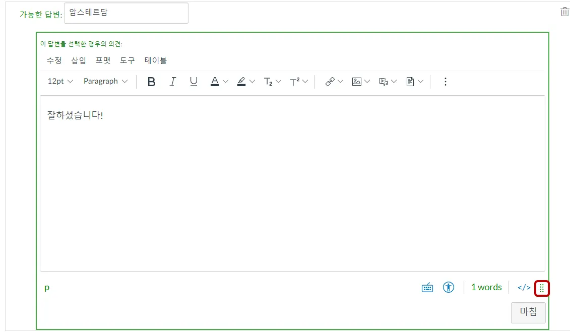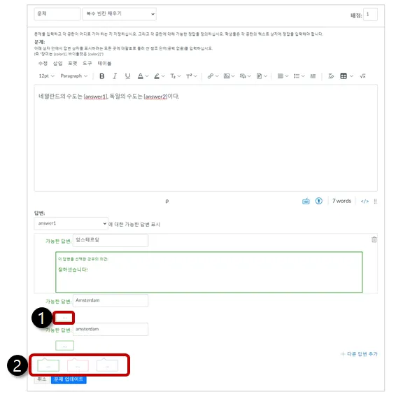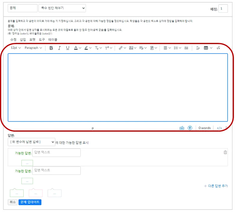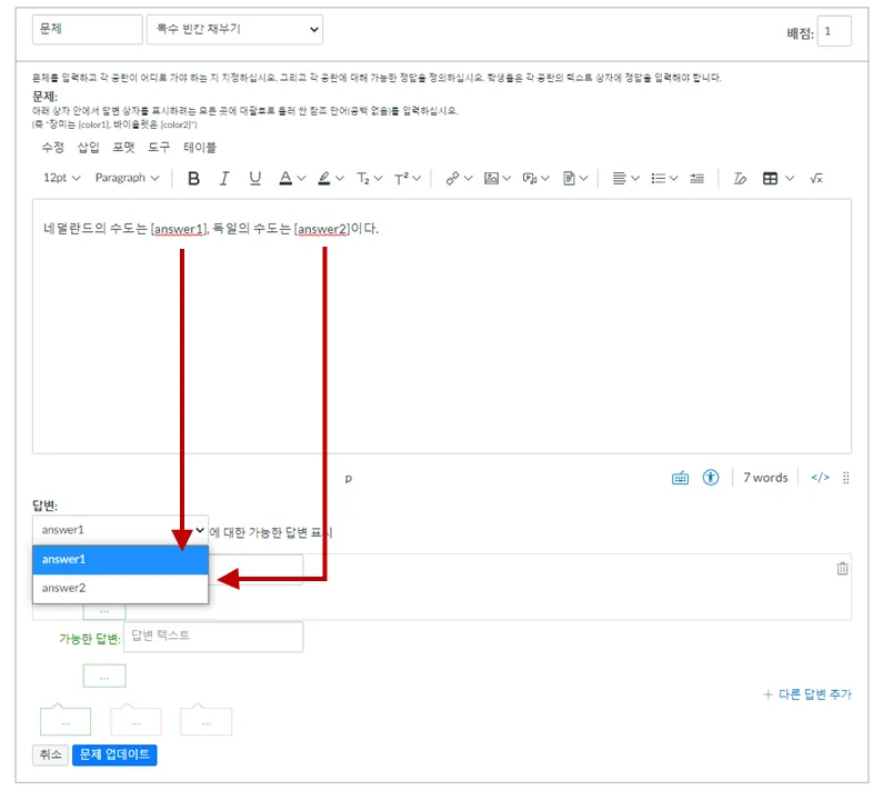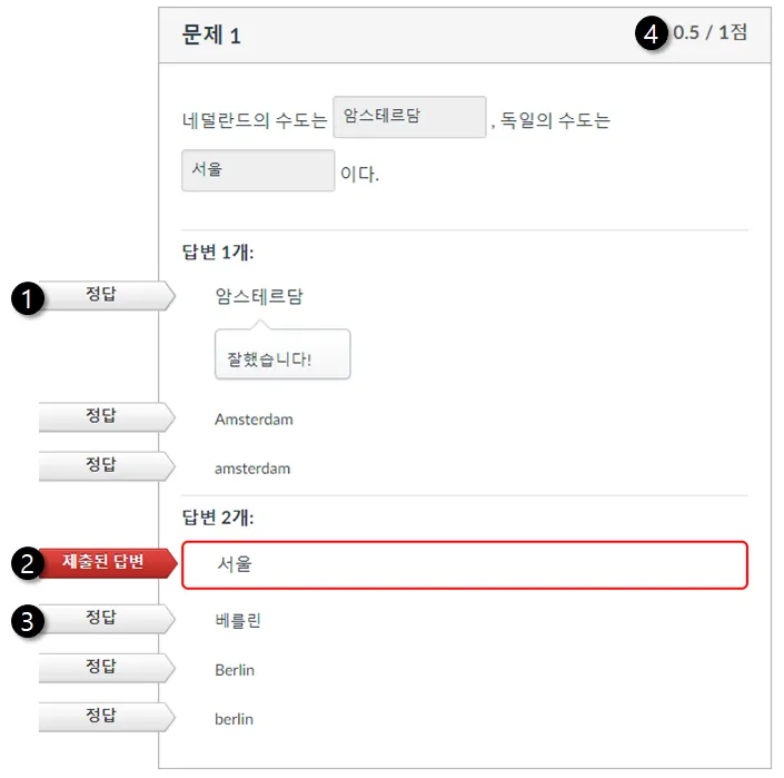해당 빈칸에 정답을 입력할 때, '가능한 답변'으로 등록한 항목 중 하나만 올바르게 입력하면 자동으로 정답으로 인정됩니다.