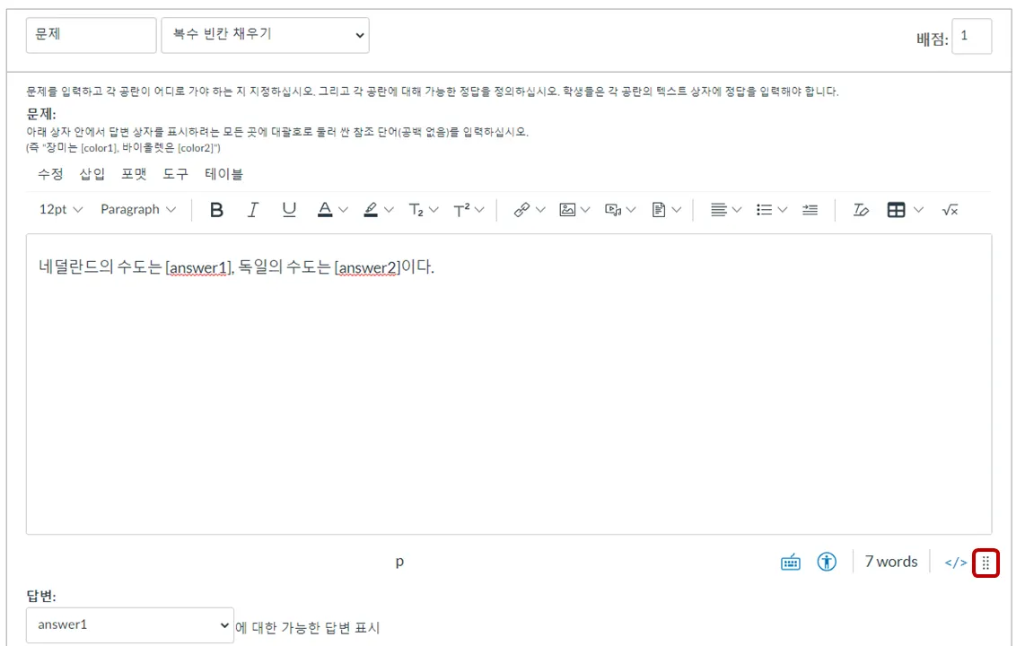 복수 빈칸 채우기 문제는 여러 개의 채우기 상자가 있는 문장을 만들거나 동일한 단계를 사용하여 목록을 만들 수 있습니다. 학생에게 표시되는 문제 텍스트를 입력하되, 누락된 정보를 대괄호 안의 변수로 대체합니다. 변수는 문자, 숫자(0-9), 밑줄(_) 및 하이픈(-)으로 구성될 수 있습니다. (공백, 마침표, 영숫자를 제외한 문자 입력 불가). 각 변수에 대한 가능한 답변 표시 기능을 통해 각각 알맞은 정답을 입력합니다.