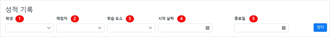 특정 성적 항목의 변경 이력을 찾으려면 학생[1], 채점자[2], 과제[3] 및 시작 날짜[4] 또는 종료 날짜[5]을 기준으로 성적 내역을 필터링 할 수 있습니다.
