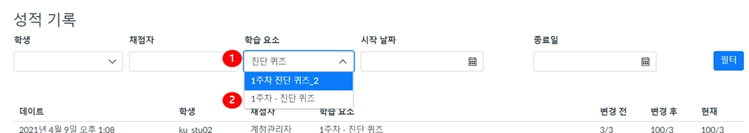 학생, 채점자 또는 과제 별로 채점 내역을 필터링 하려면 원하는 항목에 해당하는 이름/제목[1]을 입력하십시오. 일부 문구를 입력하면 일치하는 자동 검색 항목들[2]이 표시됩니다.