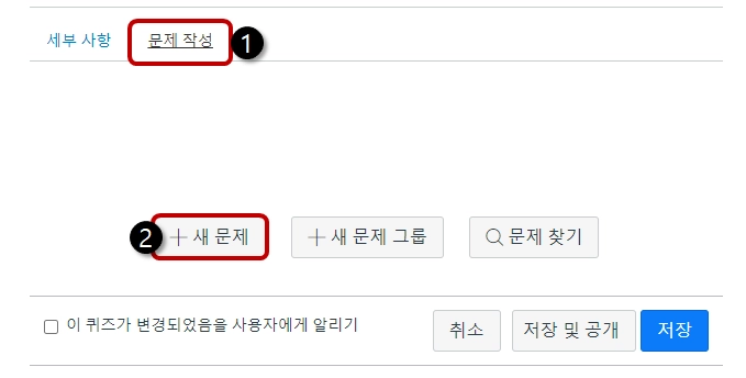 새로운 퀴즈에서 문제 작성 탭[1]으로 이동하여 [+새 문제] 버튼[2]을 눌러 문제를 추가합니다.