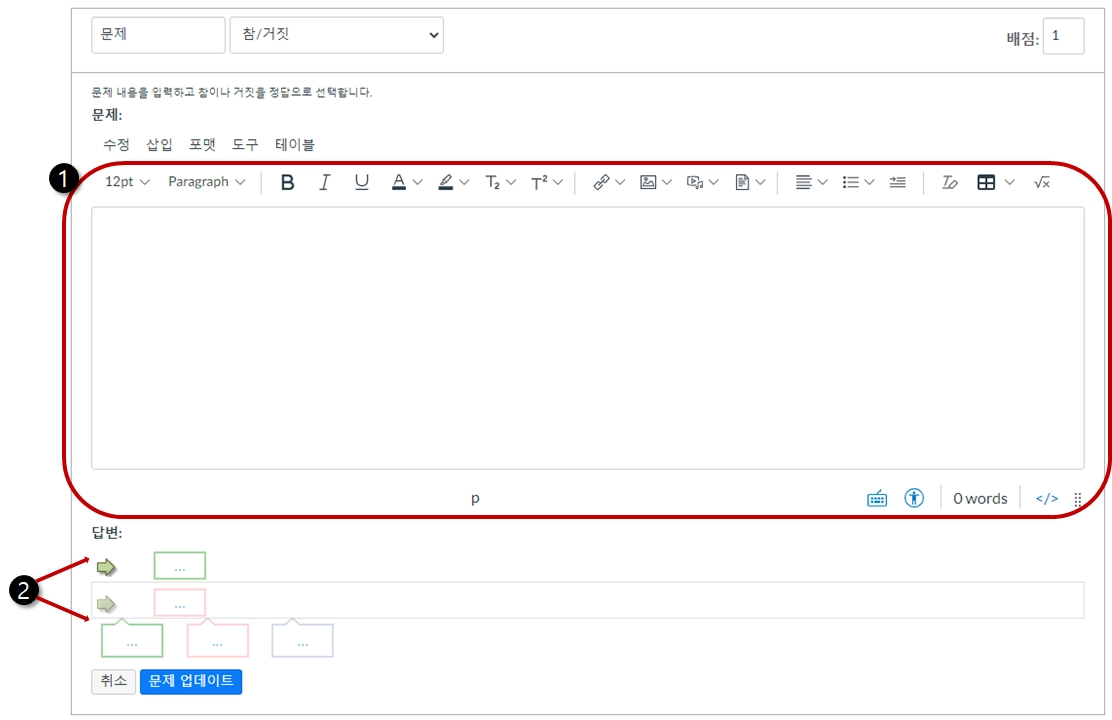 '거짓'이라고 선택할 항목이 정답이 되도록 설정할 수 있습니다. '정답' 표시 화살표를 '거짓' 항목에 표시되도록 합니다.
