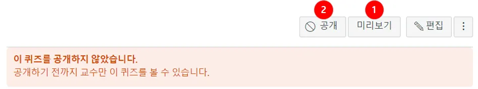 미리 보기에서 퀴즈가 원하는 방식으로 표시되어 있는 것이 확인되면 [공개] 버튼[2]을 눌러 퀴즈 상태를 공개로 전환합니다.