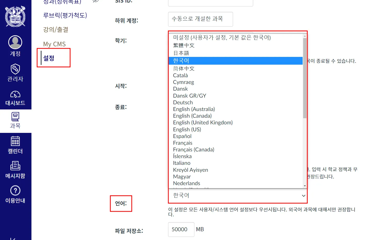 특정 과목을 지정한 언어로만 사용하도록 설정할 수 있습니다. (사용자 언어 설정보다 우선함)과목 내 [설정] 메뉴에서 ‘언어‘ 항목을 설정합니다.