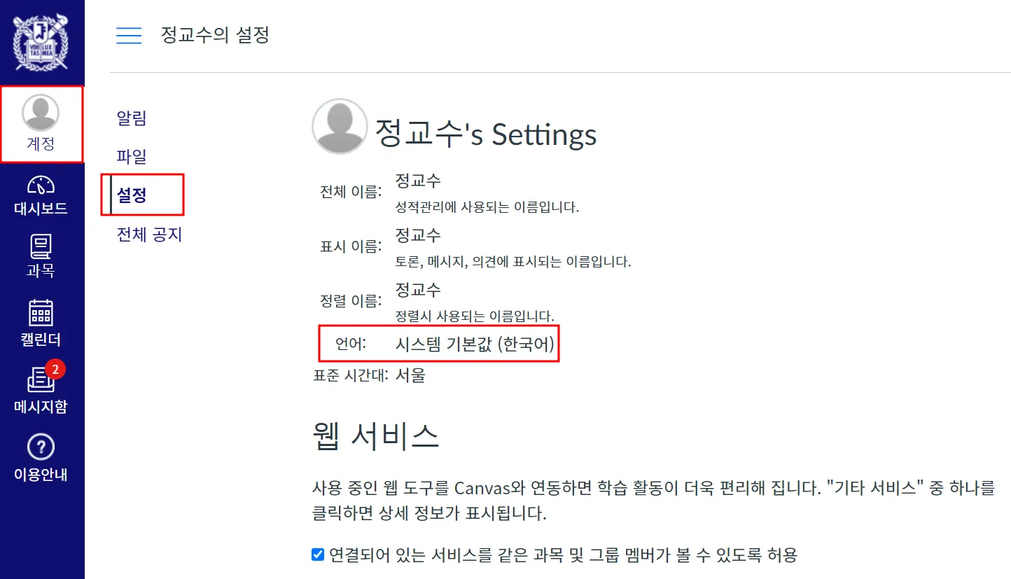 개인별로 사용 언어를 변경하여 시스템/브라우저 설정과 무관하게 어느 사이트에서도 원하는 언어를 설정하여 이용할 수 있습니다. 이 설정은 시스템이나 브라우저 언어 설정보다 우선하여 적용되지만, 특정 과목 내 지정한 언어가 있을 경우에는 이 설정과 무관하게 해당 과목의 설정 언어로 표시됩니다.