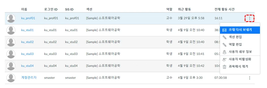 과목에서 사용자를 관리하려면 우측 상단의 [더 보기]버튼(점 3개) 을 누르십시오.