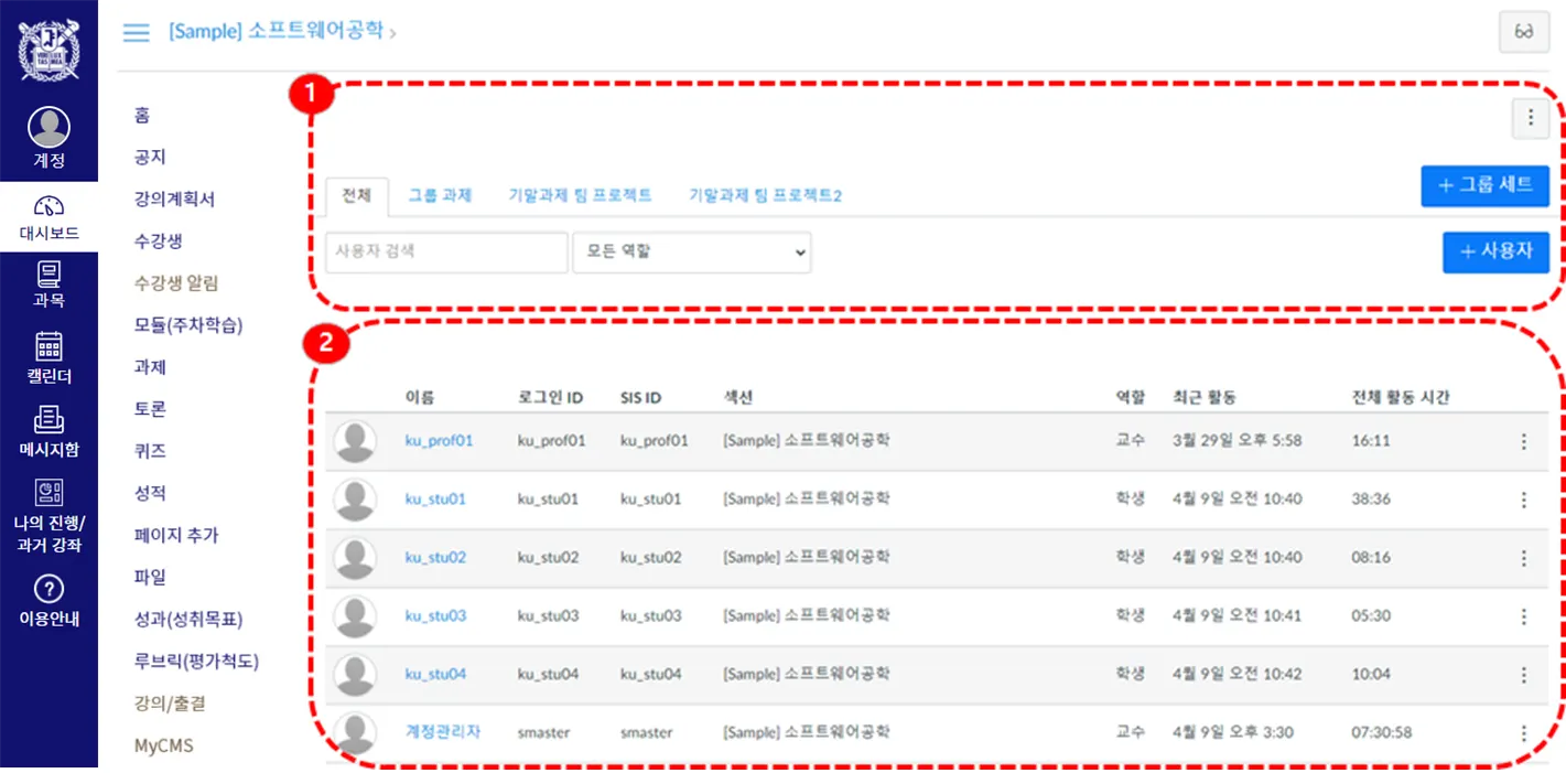 우측 [+사용자] 버튼[3]을 눌러, 과목에 수동으로 수강생/조교/청강생 등을 추가할 수도 있습니다.