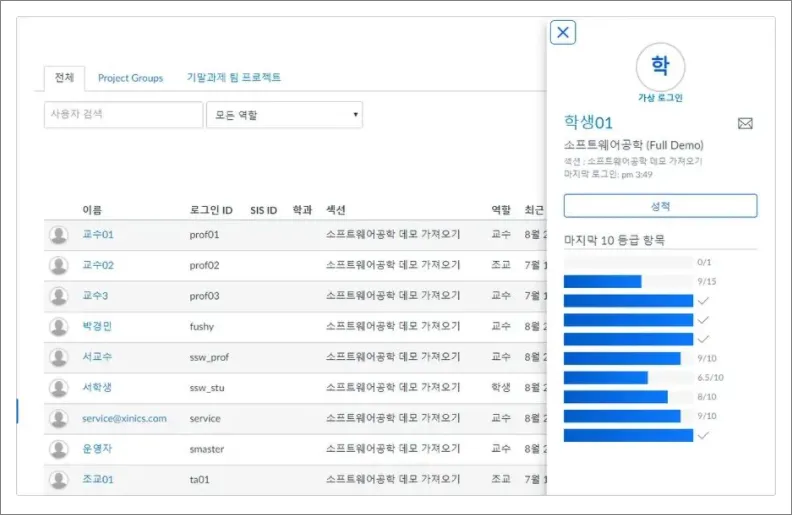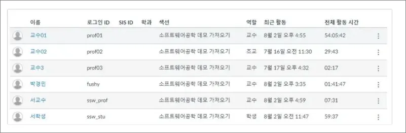 수강생 메뉴에는 과목에 추가된 사용자 정보가 표시됩니다.