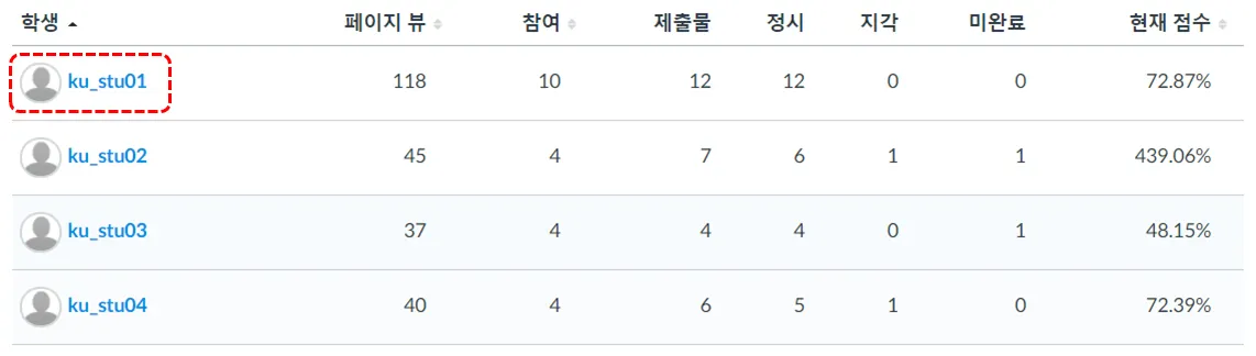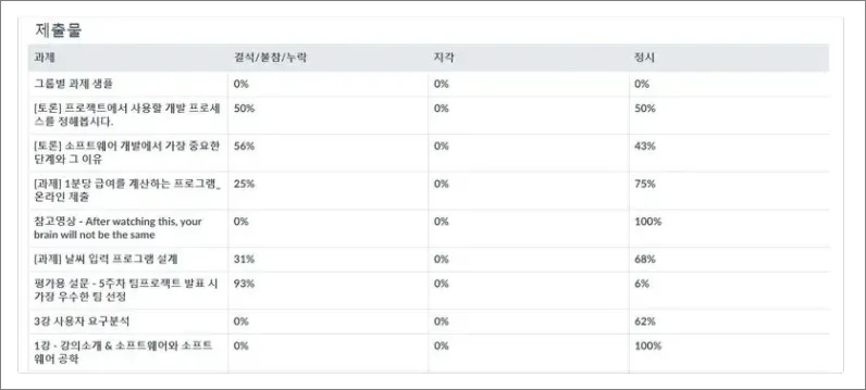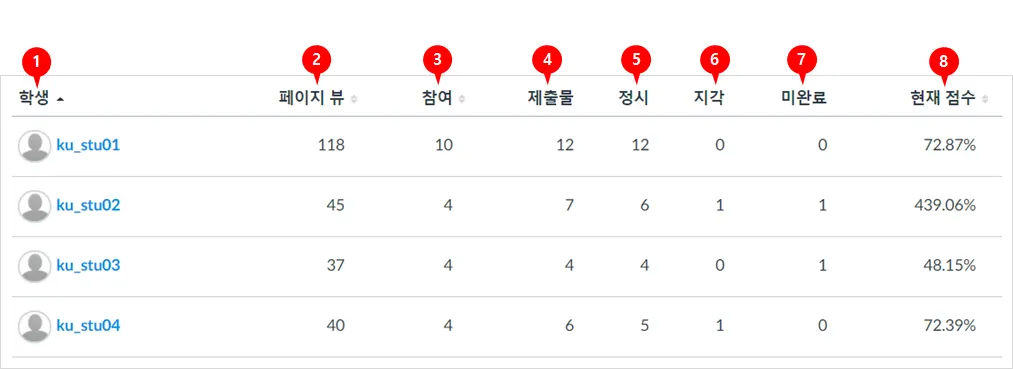 제출 상태[4] : 제출은 코스에서 각 학생에게 제시 과제 수를 나타냅니다. '강의 콘텐츠'에서 제공하는 온라인 출결 참여 내역까지를 포함하며, 제출 건수는 [5], [6], [7] 등의 제출물의 시점에 따라 세분화됩니다.
