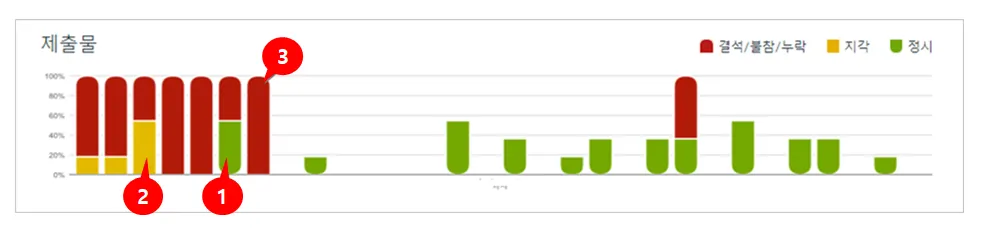 막대 하단의 녹색 영역은 기한 내 과제를 제출 한 학생 수[1]를 나타냅니다.노란색 영역은 얼마나 많은 학생들이 과제 기한보다 늦게 제출했는지[2]나타냅니다.막대 상단의 빨간색 영역은 과제를 제출하지 않은 학생들의 수[3]를 나타냅니다.