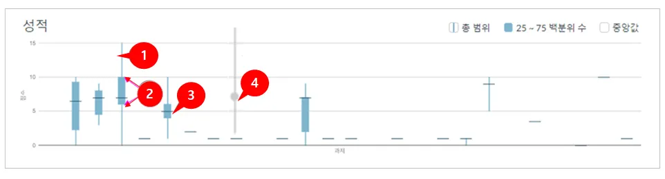 [1] 수직의 파란 선은 각 과제들의 취득 점수 분포 중 가장 낮은 점수에서 가장 높은 점수까지 표시됩니다 .[2] 파란색 사각 도형은 25% ~75%까지의 점수 분포를 표시합니다.[3] 수평 검정 선은 해당 과제의 중간 점수를 나타냅니다.[4] 회색 선은 알림을 꺼둔 과제를 나타냅니다.