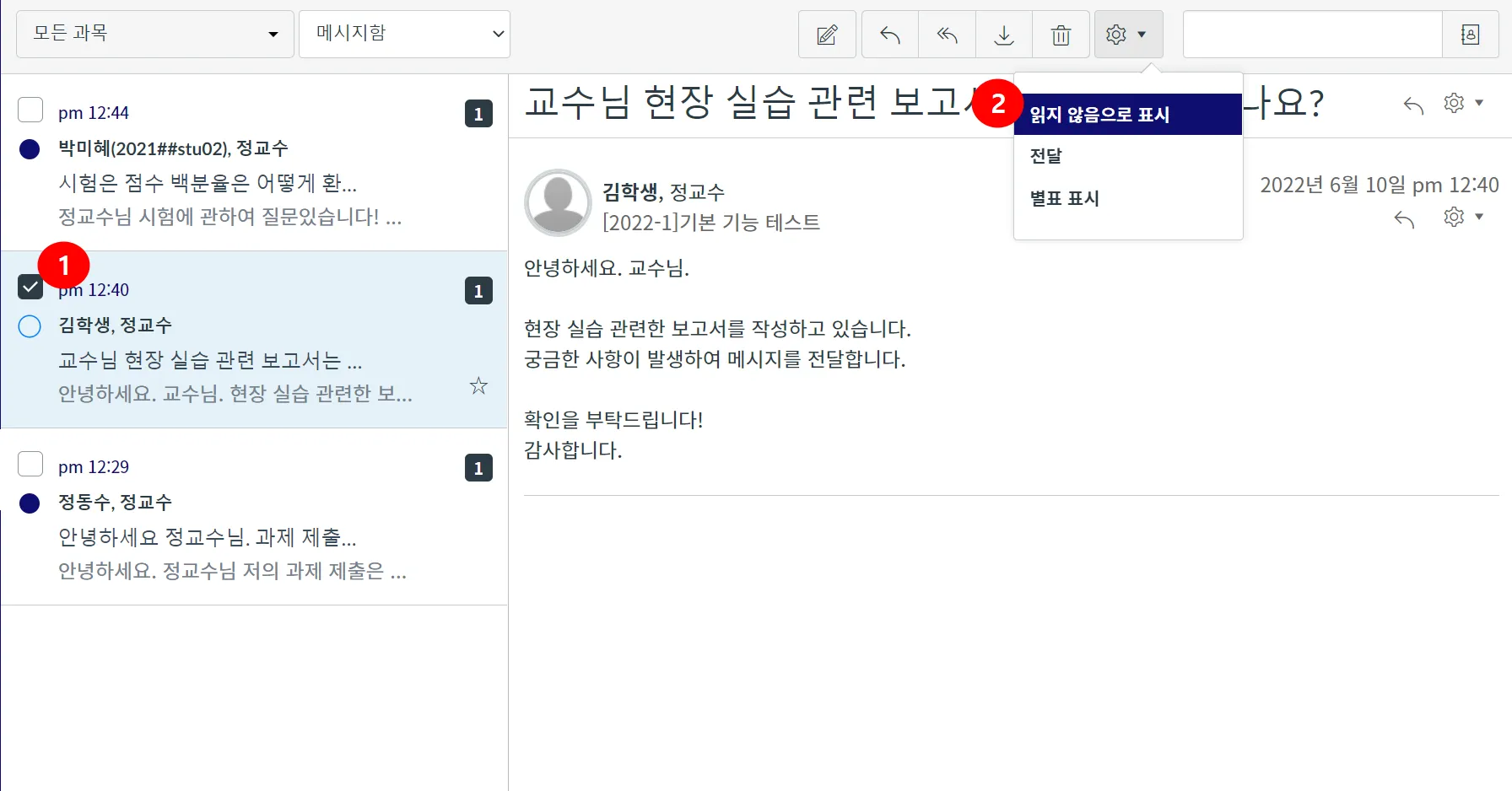 λ©μμ§ λ¦¬μ€νΈλ μλ¨μ λλ‘ λ€μ΄ λ©λ΄λ₯Ό ν΅ν΄ βνΉμ κ³Όλͺ©β νΉμ βλ©μμ§ν¨β μ νμ νν°λ§ νμ¬ μ λ ¬ν μ μμ΅λλ€. λ©μμ§ λ¦¬μ€νΈλ₯Ό ν΅ν΄ μμ ν λ©μμ§λ₯Ό νμΈνκ³ νμ ν μ μμ΅λλ€. μμ /λ°μ ν μ μλ λ©μμ§Β μ체μλ νμΌ ν¬κΈ° μ νμ΄ μμ΅λλ€.Β κ·Έλ¬λ λ©μμ§μ μ²¨λΆ λ νμΌμ λ³΄λΈ μ¬λμ κ°μΈ νμΌ μ©λμ ν¬ν¨λ©λλ€.