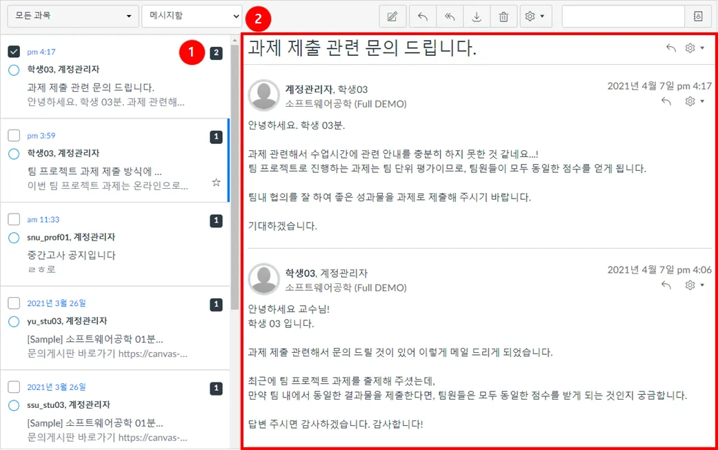λ©μμ§ λ¦¬μ€νΈμμ λ©μμ§[1]λ₯Ό μ ννλ©΄Β ν΄λΉ λ©μμ§μ μ°κ²°νμ¬ μ£Όκ³ λ°μ λͺ¨λ λ©μμ§κ° μ°μΈ‘Β λ©μμ§ μ°½[2]μ λνλ©λλ€.