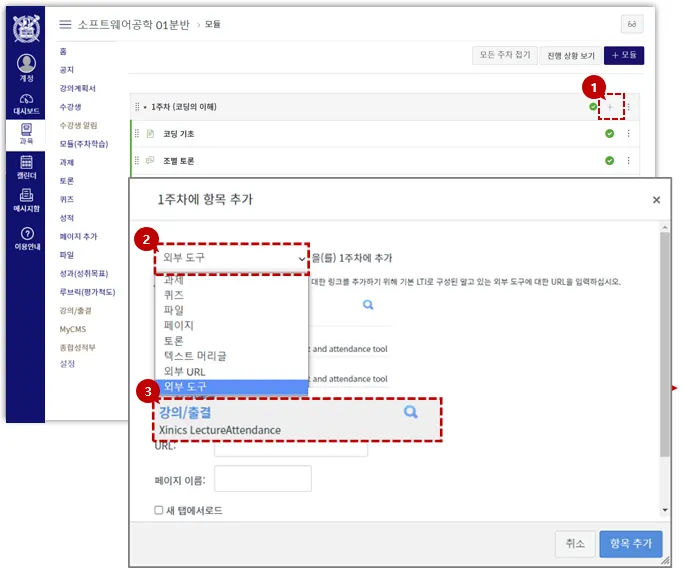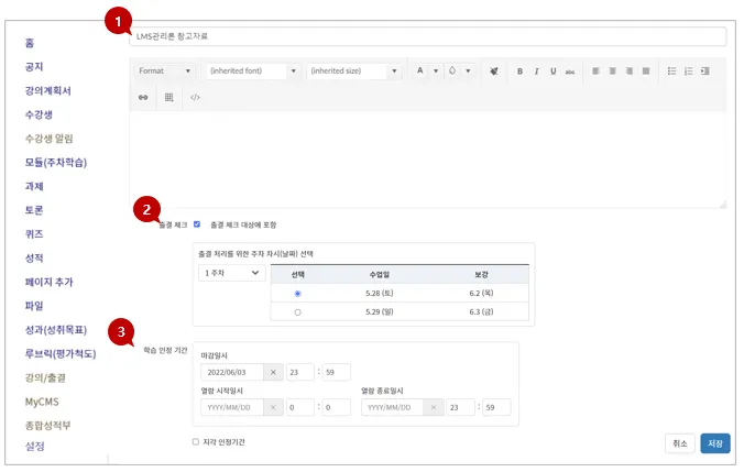 출결 대상 학습 요소를 업로드하시는 경우, 출결 체크를 위한 주차 및 수업일, 보강일을 설정하는 항목이 표시됩니다. 주차를 선택하시면 해당 주차에 상응하는 수업일과 보강일이 학사 일정을 기준으로 표시되며 필요에 따라 학습 인정 기간을 변경할 수 있습니다.