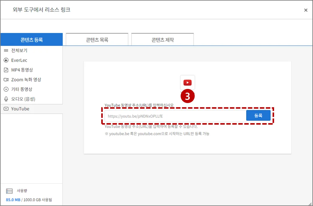 2-3. 유튜브 링크(URL)를 입력한 후 등록을 클릭합니다.