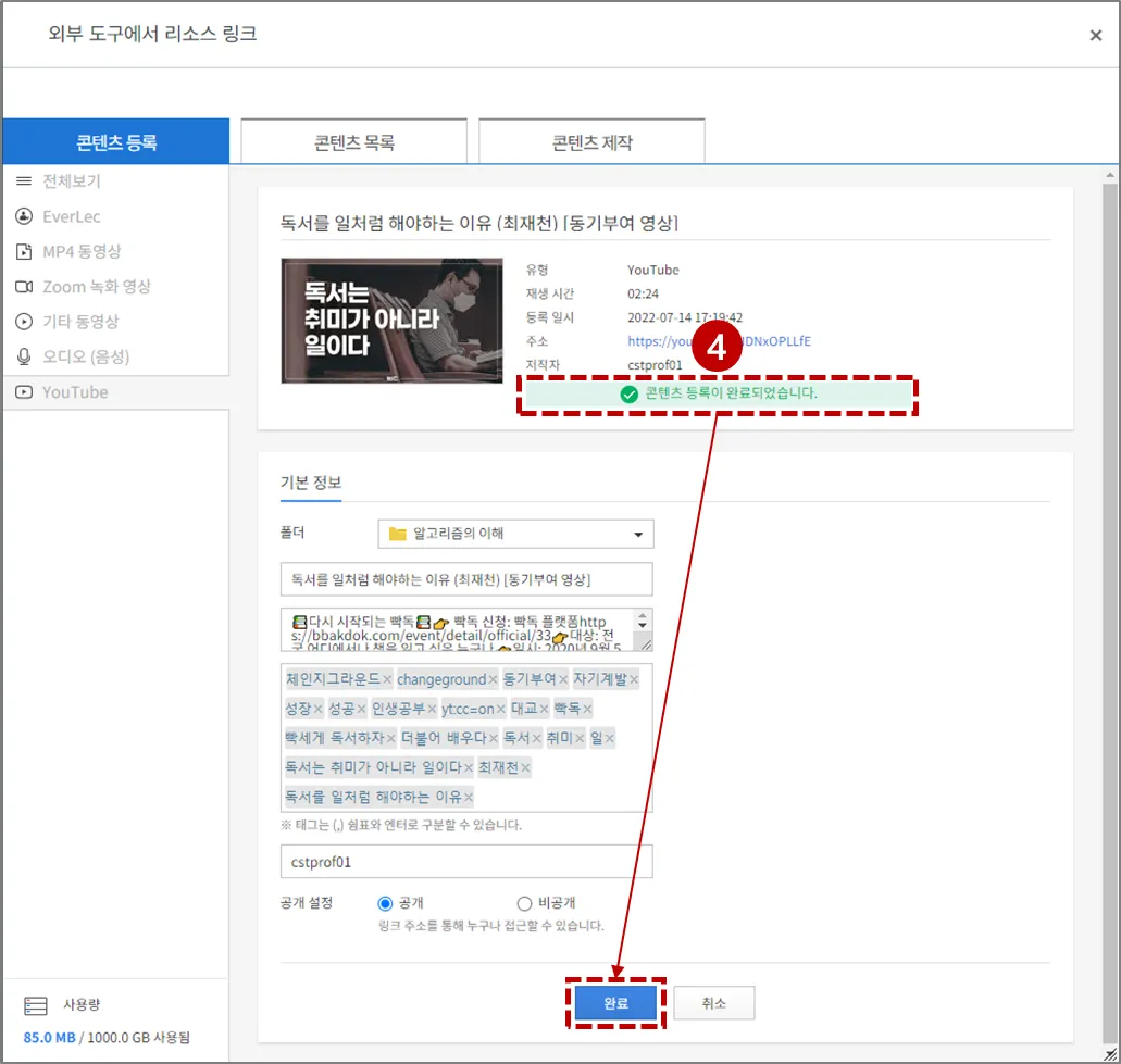 2-4. 등록 완료 문구(콘텐츠 등록이 완료되었습니다.)를 확인한 후 완료를 클릭합니다.
