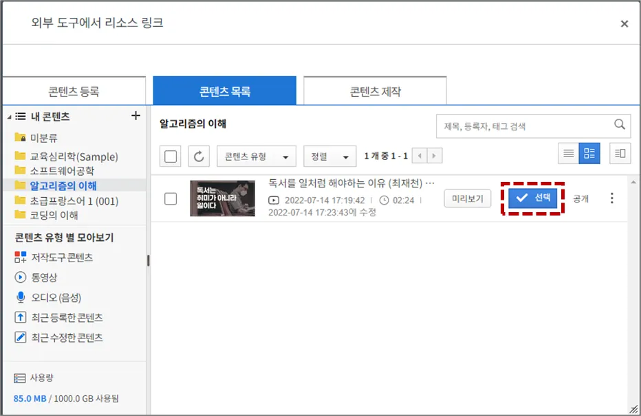 2-5. MyCMS 업로드 창이 뜨면 콘텐츠 우측의 선택을 클릭하여 유튜브 영상을 업로드 합니다.