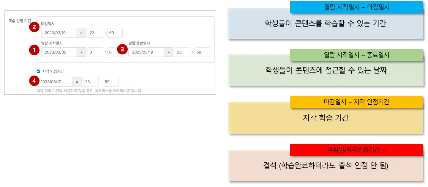 마감일시 : 학습요소의 학습을 마감하는 출석 마감 일시를 의미합니다.