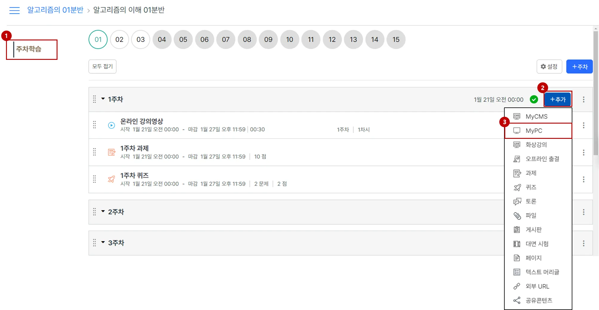 해당 주차의 [+ 추가] 버튼을 클릭합니다.
