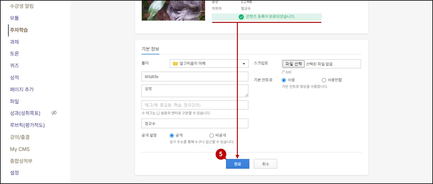 “콘텐츠 등록이 완료되었습니다.” 문구가 나타나면 [완료] 버튼을 클릭합니다.
