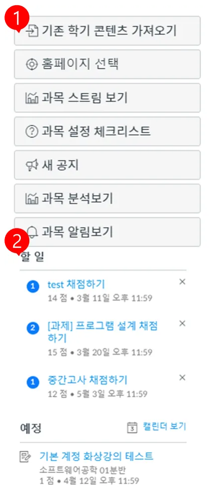 과목 메뉴 우측의 과목 관리 메뉴[1]와 할 일/예정 목록[2]은 대시 보드 우측 메뉴와 동일한 구성과 기능을 갖지만, 해당 과목 내의 항목 및 추가 옵션 만을 표시합니다.