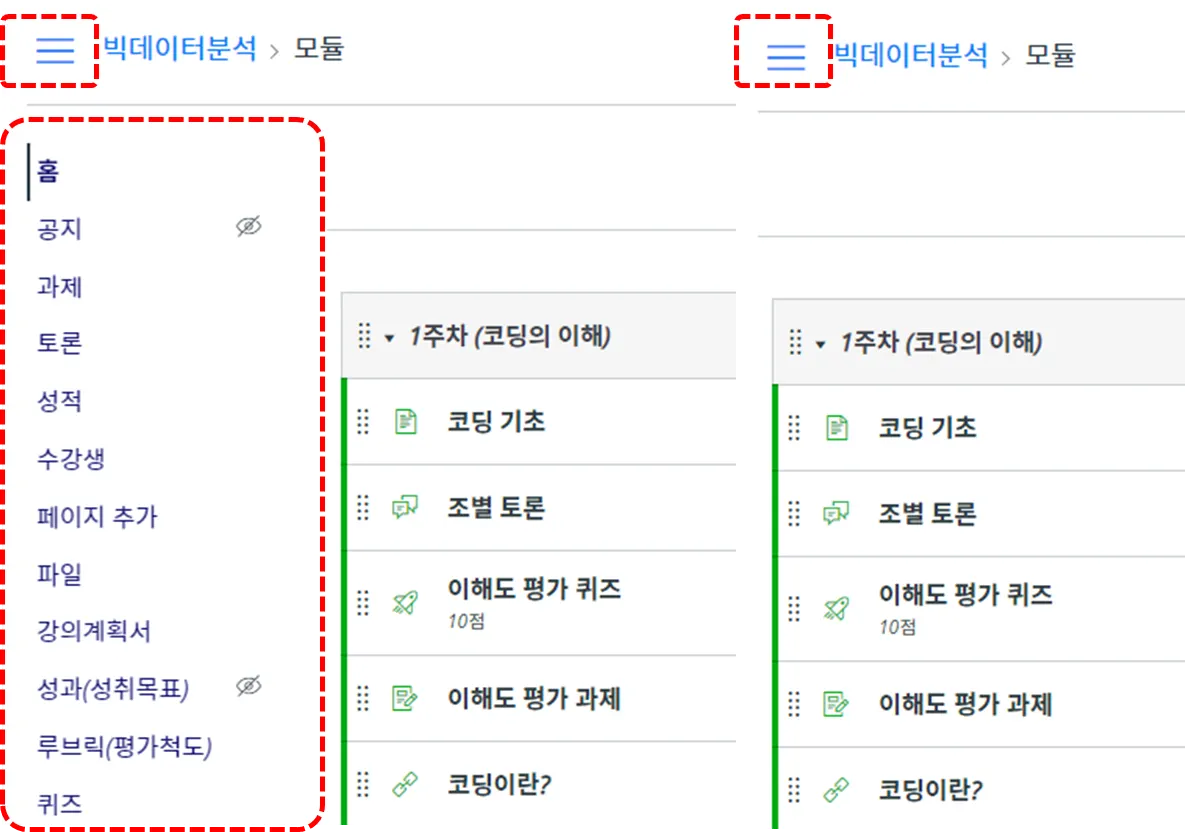 교수자는 과목에 표시되는 메뉴의 사용 여부와 배치 순서를 사용자 정의 할 수 있습니다.