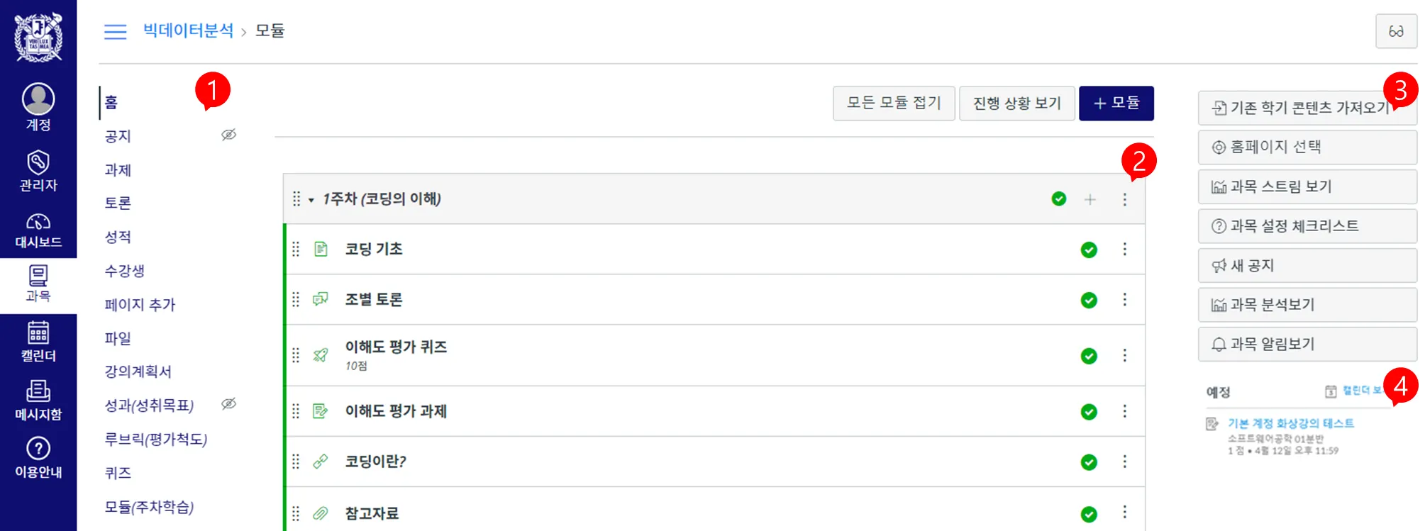 과목 홈은 좌측부터 과목 메뉴[1], 모듈 [2], 과목 관리 메뉴[3] 및 할 일/예정 목록[4] 으로 구성되어 있습니다.