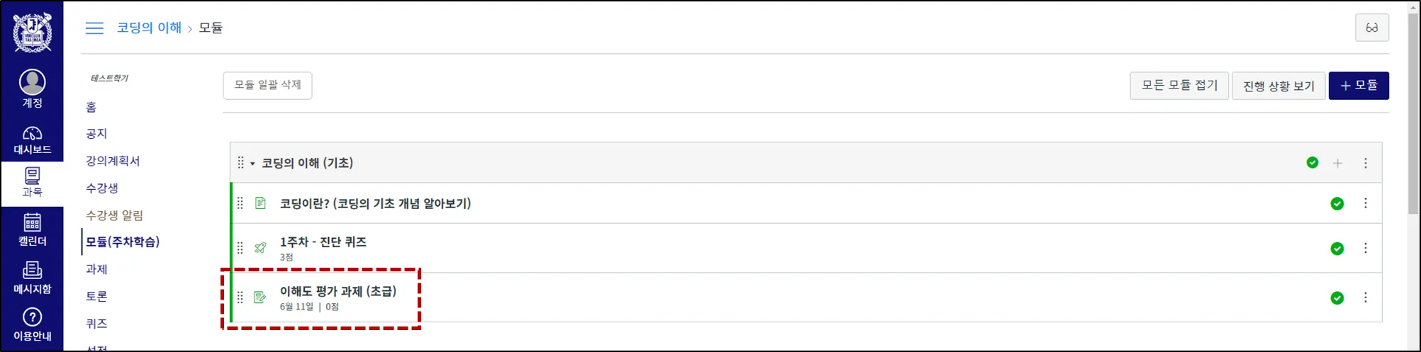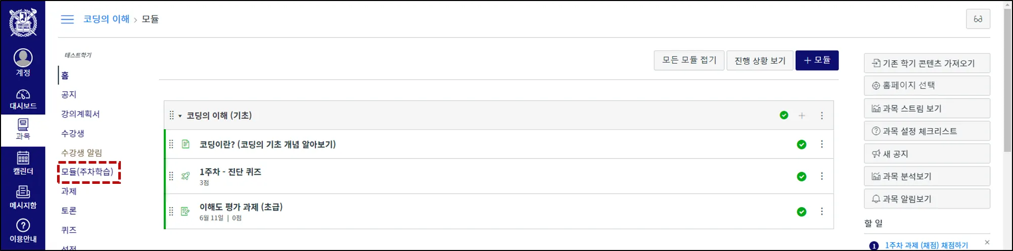 과목 메뉴에서 모듈(주차학습)을 눌러 이동합니다.