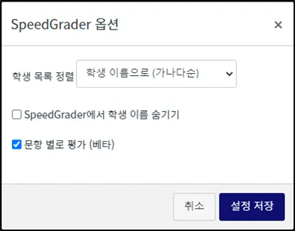 SpeedGrader 옵션에서 '문항 별로 평가'를 체크하면 학생들의 응시 현황을 문항 별로 열람할 수 있습니다.