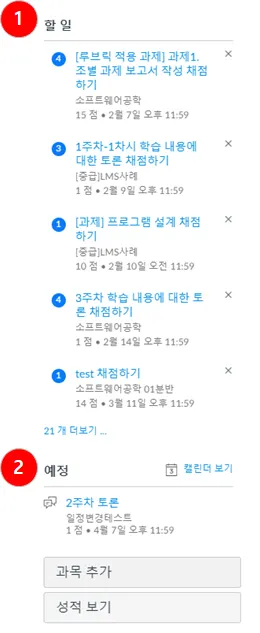 예정[2] 섹션에는 다음 7일 간 예정된 항목이 표시되고. 이 항목에는 제출이 필요하지 않거나 미평가 퀴즈 및 과제가 포함될 수 있지만 이러한 과제 유형은 교수자의 ‘할 일’ 채점 목록에는 표시되지 않습니다. 일부 항목은 여러 마감일이 표시될 수 있습니다. 예정 섹션에는 날짜별로 최대 20개 항목까지 표시됩니다.