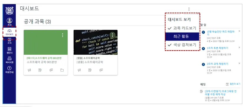 대시보드는 eTL에 로그인하면 볼 수 있는 첫 화면입니다. 기관에 따라 대시보드를 ‘과목 카드 보기’ 또는 ‘최근 활동’의 두 가지 보기 중 하나로 기본 설정할 수 있습니다.