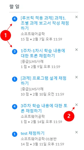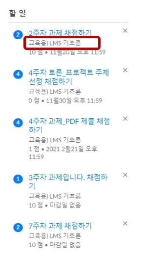 대시보드 우측에는 모든 과목의 ‘할 일 목록’이 표시됩니다. 목록의 항목들은 각각 특정 과목과 연결되어 있습니다. 대시보드에서 즐겨 찾기를 설정한 과목 뿐만 아니라 모든 활성화된 코스의 할 일 항목이 이곳에 표시됩니다.