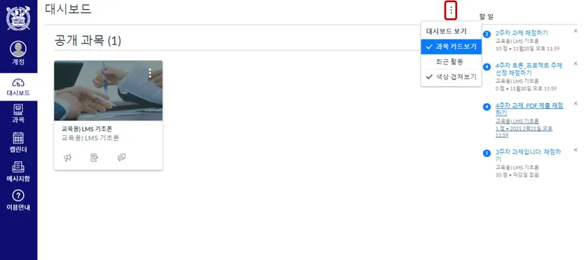 과목 카드 보기 : 즐겨 찾는 모든 과목에 빠르게 접근 할 수 있도록 과목 카드를 표시합니다 (글로벌 탐색 메뉴 과목에 동일한 과목 리스트가 표시됨).
