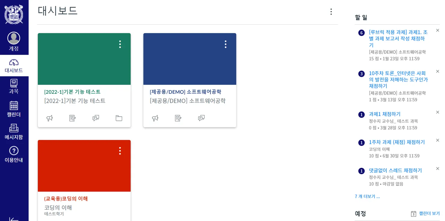 대시보드는 eTL 에 로그인하면 볼 수 있는 첫 화면입니다. 대시보드는 현재 계정의 모든 과목 리스트와 할 일, 최근 변경 사항 등을 표시합니다.