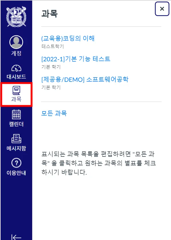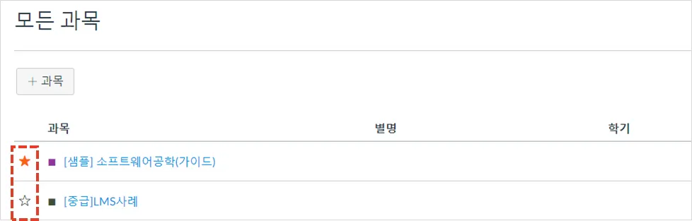 ‘모든 과목’ 메뉴를 선택하면 내 과목 전체 리스트가 나타나며, ★별표를 선택해 두면 ‘과목 바로가기’와 대시보드 목록에 나타나도록 설정할 수 있습니다.